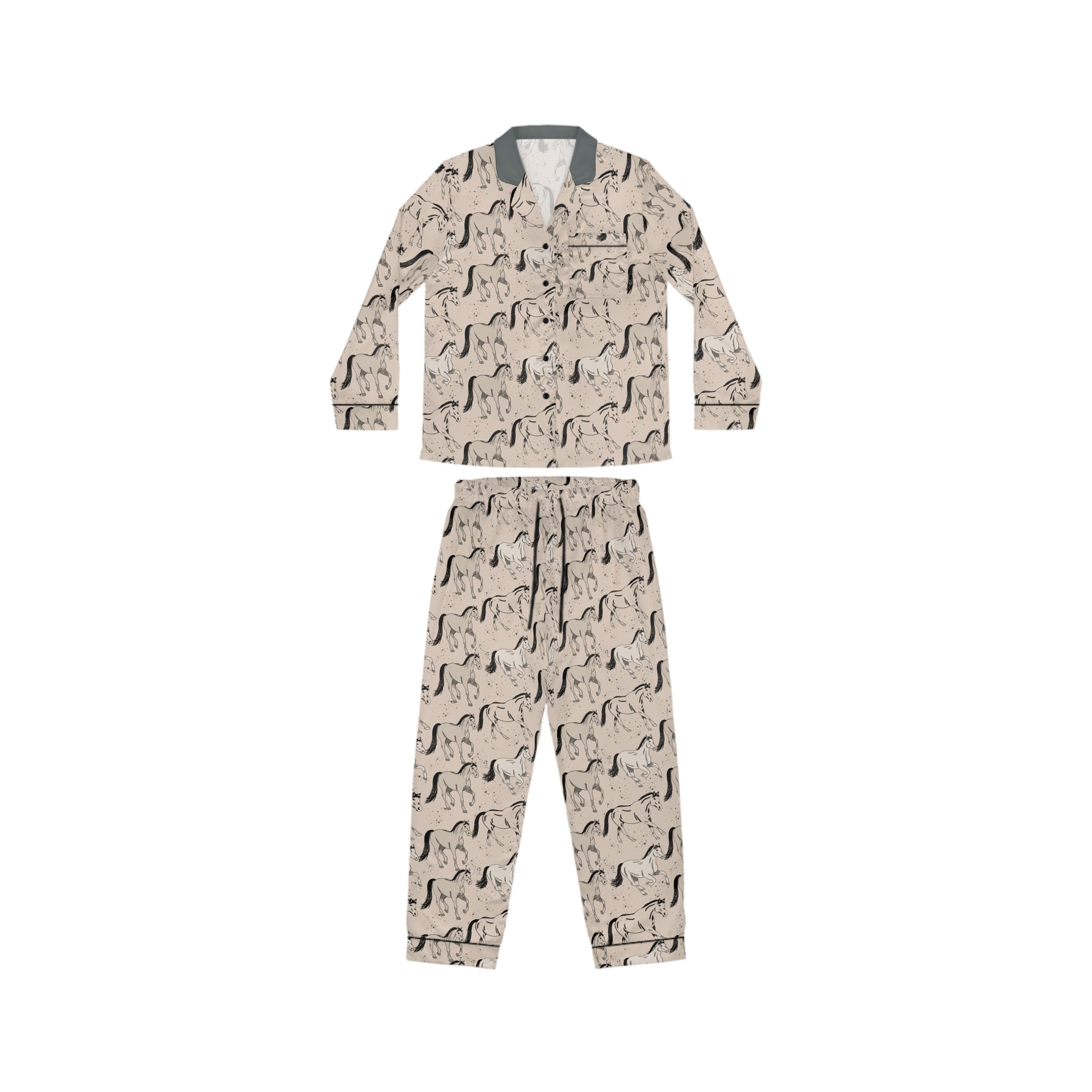 Slip into these pajamas and let supreme comfort and style elevate every evening. Crafted with a buttery 95% satin polyester and 5% spandex blend, the Classic Herd set glides gently over the skin, offering that sought-after, draped look only true luxury pajamas provide. A classic notch collar, adjustable drawstring waist, and lustrous black trim transform your downtime into a curated experience—whether you’re settling in with a book, sharing cocoa by the fire, or gifting a fellow horse lover their new favorite evening ritual.
